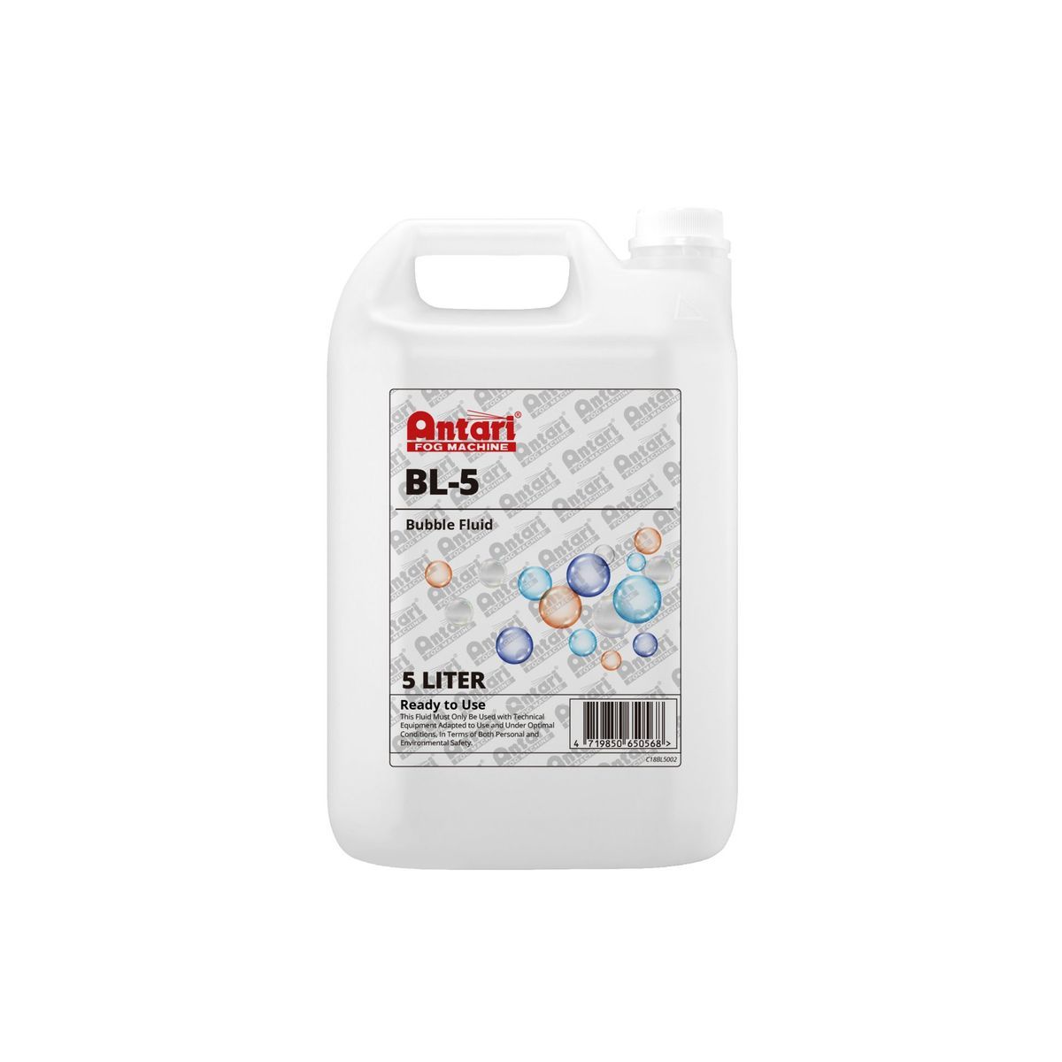 Antari BL-5 - разработана для использования в машинах мыльных пузырей ANTARI B-100,B-100Х, B-200 и W-101. Жидкость имеет водную основу, которая оставляет небольшое количество осадка. Бесцветная, без запаха и не воспламеняется. Эта жидкость разработана для того, чтобы производить наиболее прозрачные пузырьки. Доступна в емкости 5 литров.
