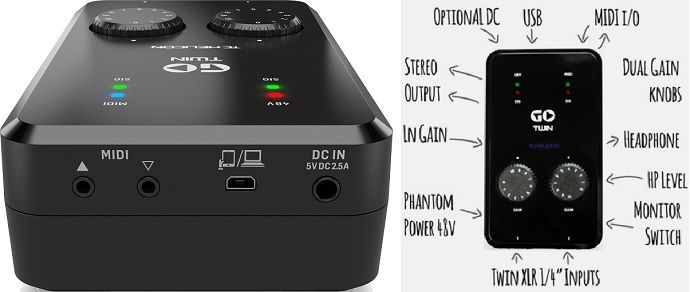 Go Twin, как и Go Solo, является компактным аудиоинтерфейсом для качественной записи без привязки к стационарному студийному оборудованию, имеет на борту предусилитель с фантомным питанием, выход для наушников, MIDI IN/OUT.
