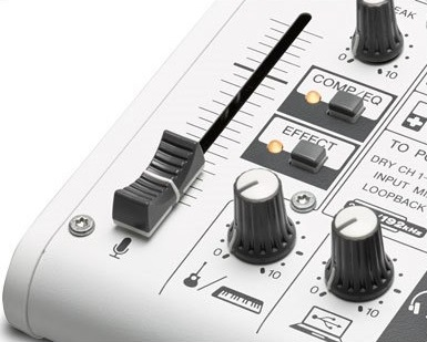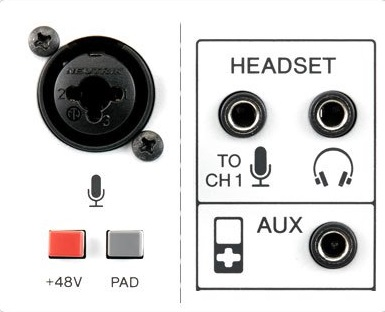 Микшер имеет вход с фантомным питанием и вход для головной гарнитуры для подключения профессионального конденсаторного микрофона или обычных компьютерных наушников с микрофоном.